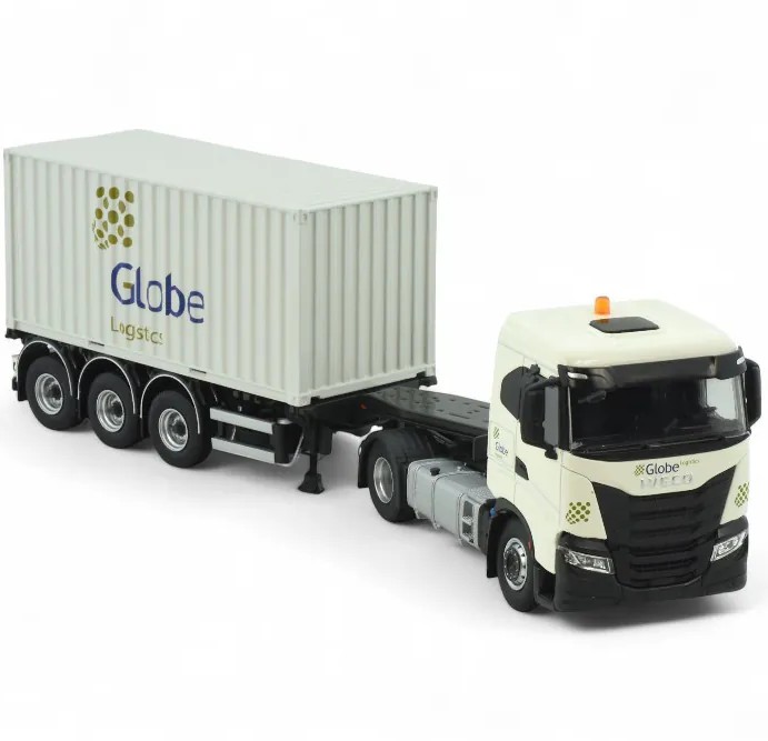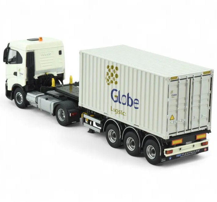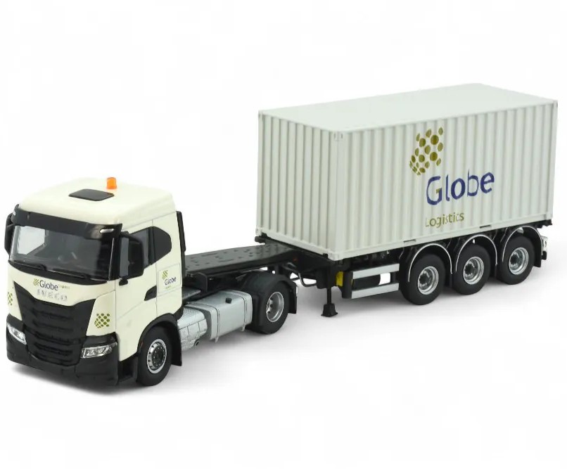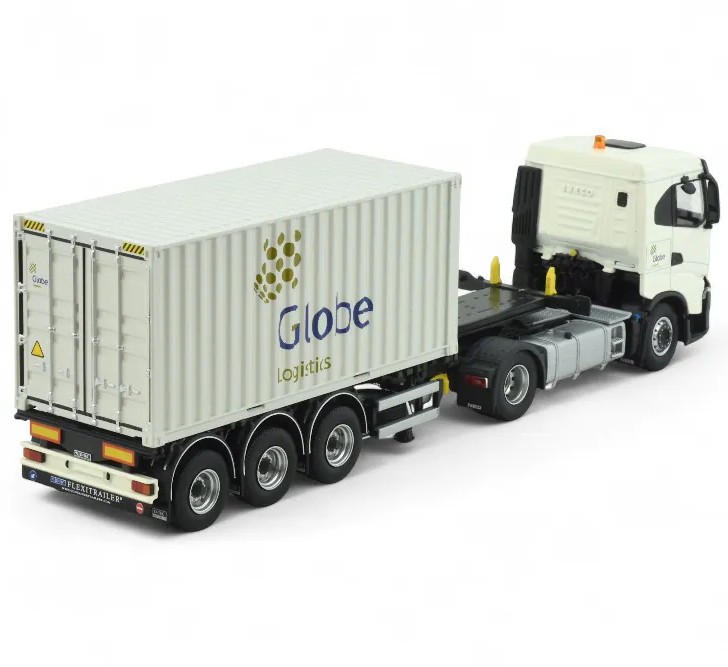 Miniatura do Caminhão Iveco, 4×2, cabine leito baixa com carreta porta container 3 eixos e container 20 pés Globe na escala 1:50.