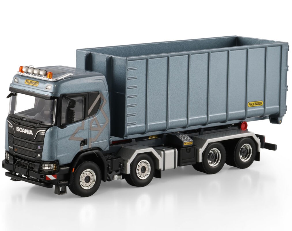 Miniatura do Caminhão Scania, R520, 8×4 com Conteiner de Elevação de Gancho Palfinger na escala 1:50.