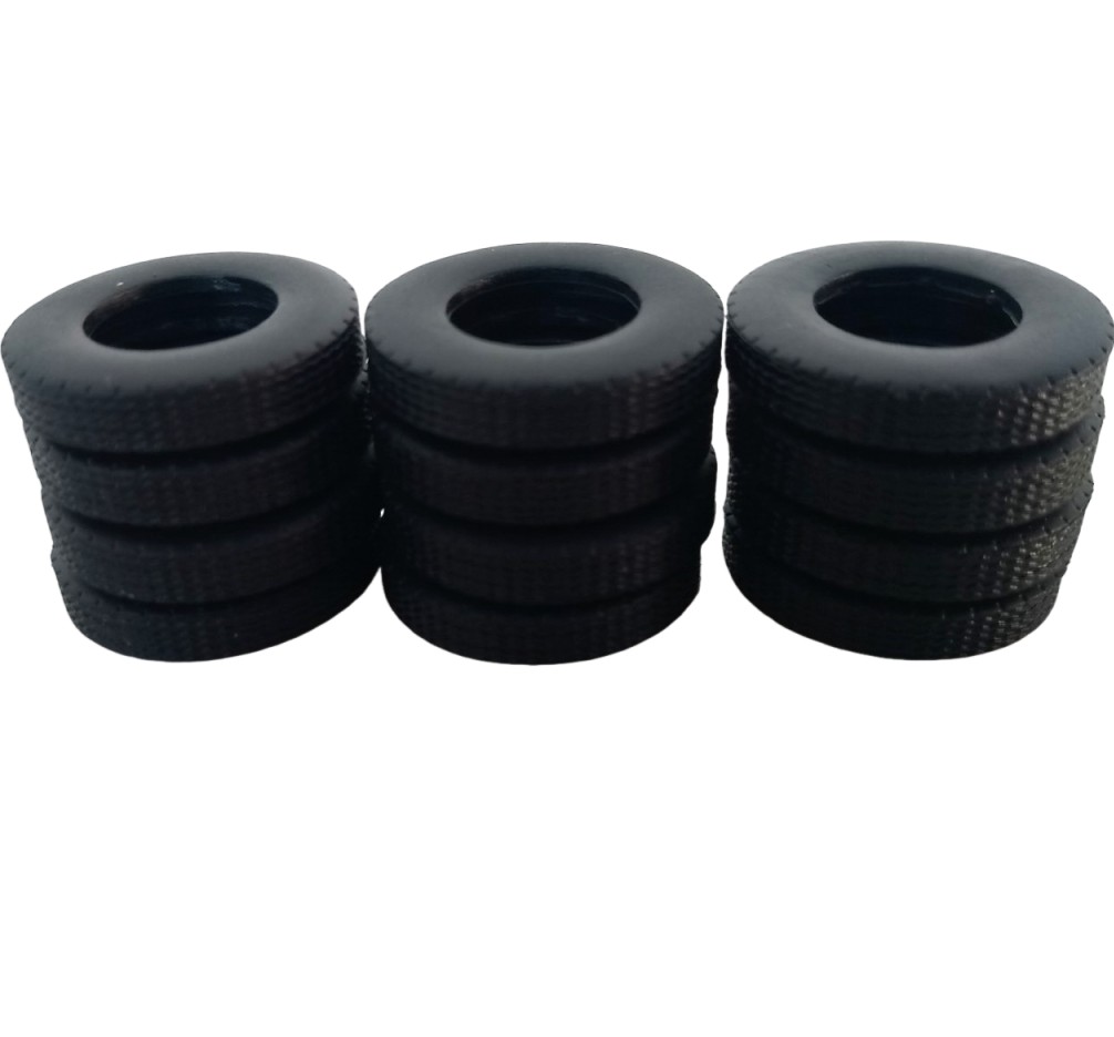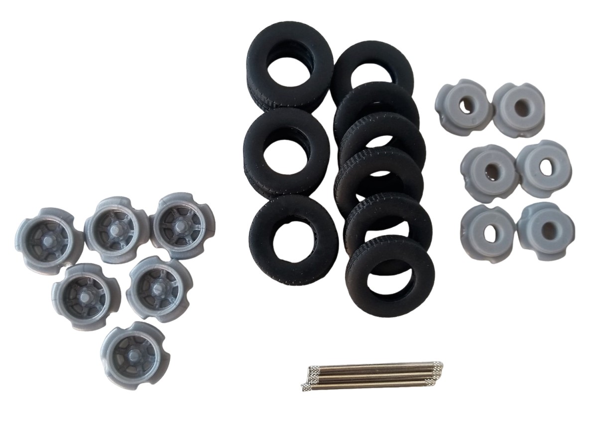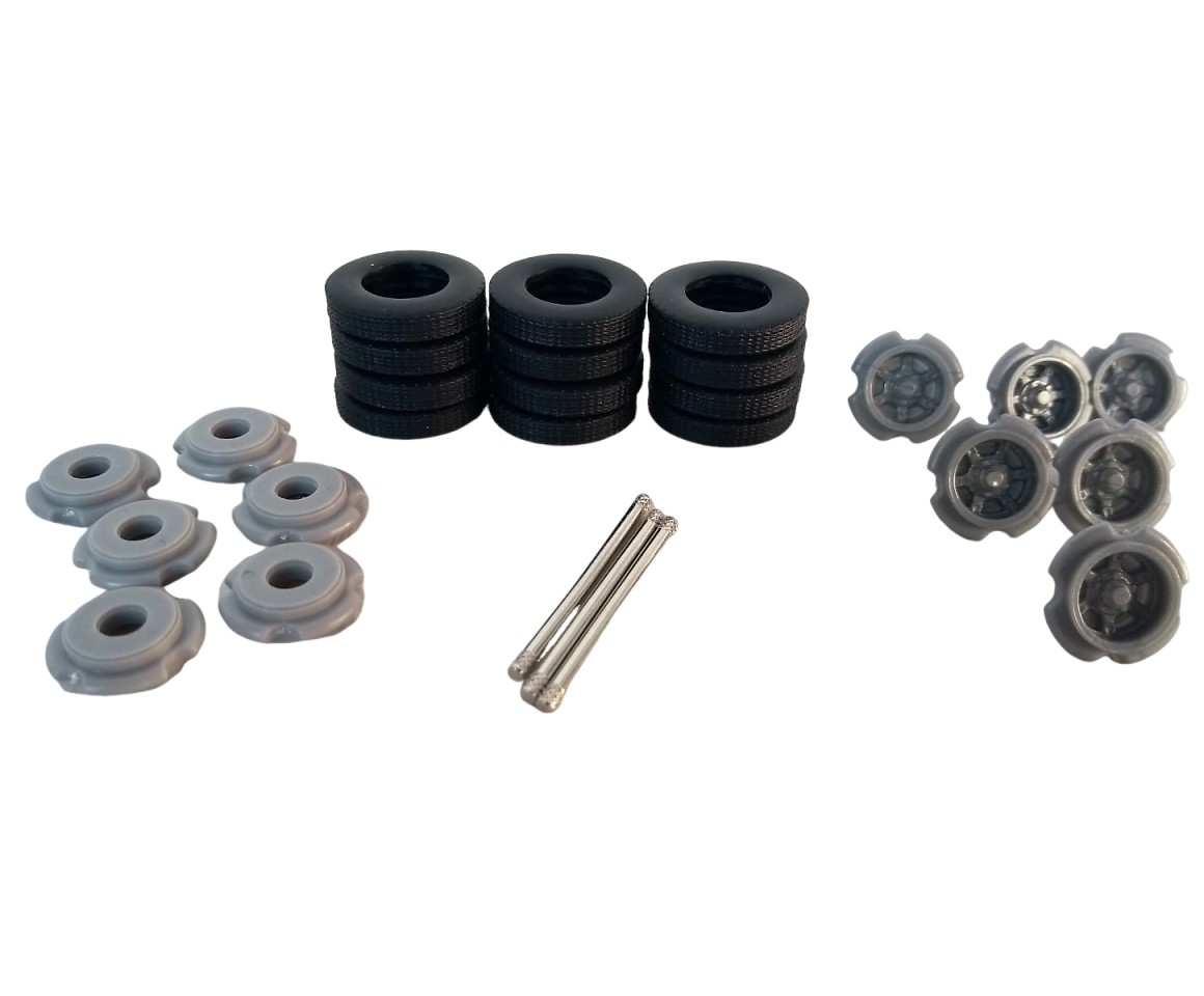 Kit de três eixos com rodas raiadas, pneus e eixos para montagem em Miniaturas de carretas na escala 1:50.